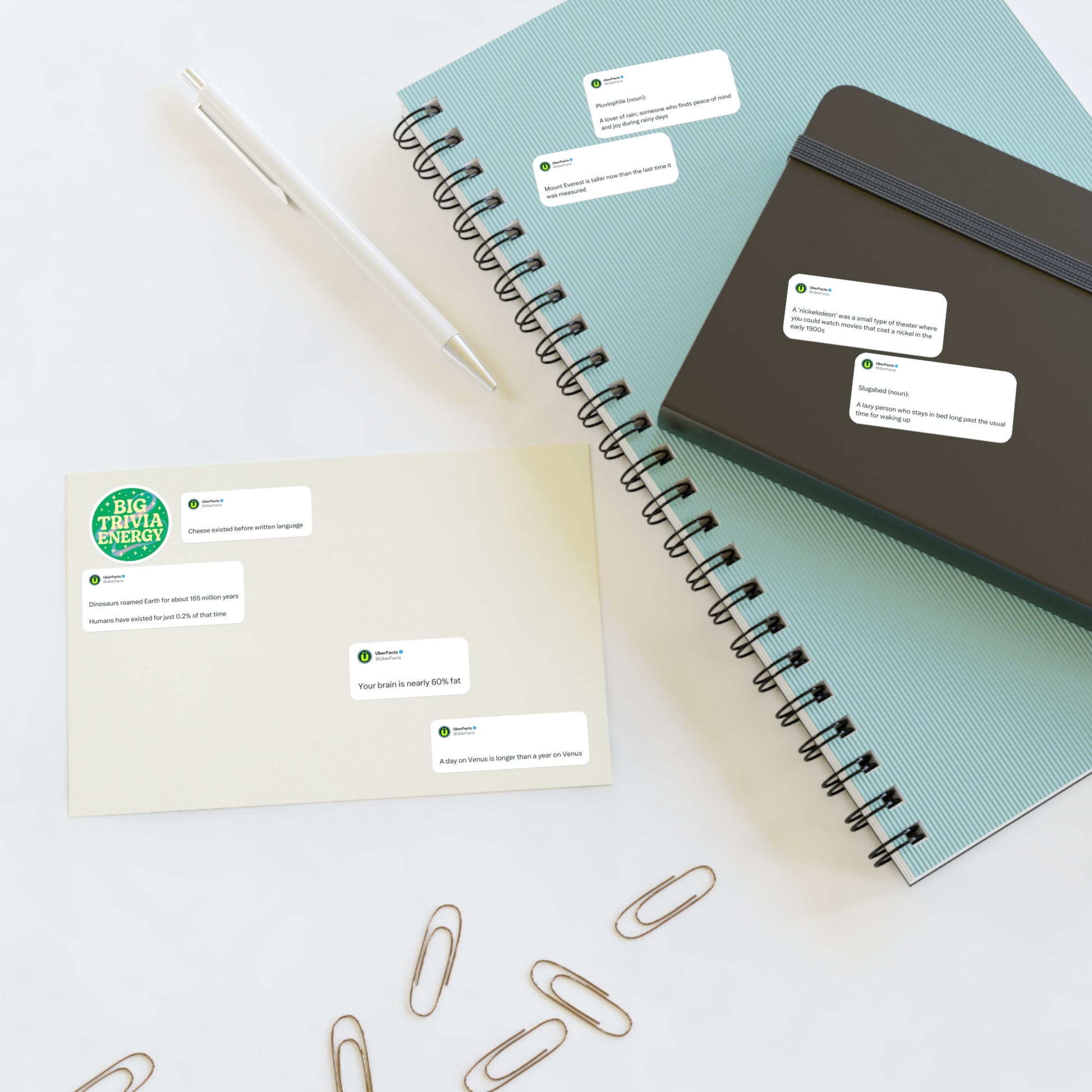 A curated sheet of softly intriguing UberFacts — including the green Big Trivia Energy sticker. Use them to lighten, spark curiosity, or inspire any space.